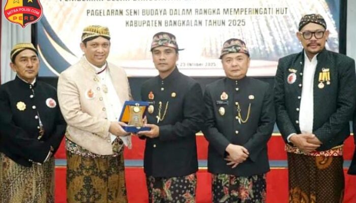 Bangkalan- mitrapolisi.com Bupati Bangkalan Lukman Hakim dan Wakil Bupati Moh Fauzan Ja’far menerima gelar bangsawan di malam peringatan Hari Jadi Bangkalan ke-494 tahun 2025, di Pendopo Agung Jalan Letnan Abdullah pada Kamis (23/10/2025). Penganugerahan gelar tersebut diberikan langsung oleh Dewan Pendiri Masyarakat Adat Nusantara (Matra) Kanjeng Gusti Pangeran Adipati Aryo (KGPAA) Mangku Alam II.