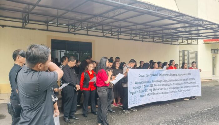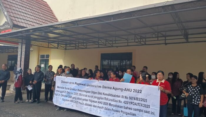 Puluhan dosen dan pegawai Universitas Darma Agung (UDA) Medan menggelar aksi demo di depan Gedung Rektorat, Jl. Dr. TD Pardede No. 21 Medan, Selasa (4/11/2025) pagi.