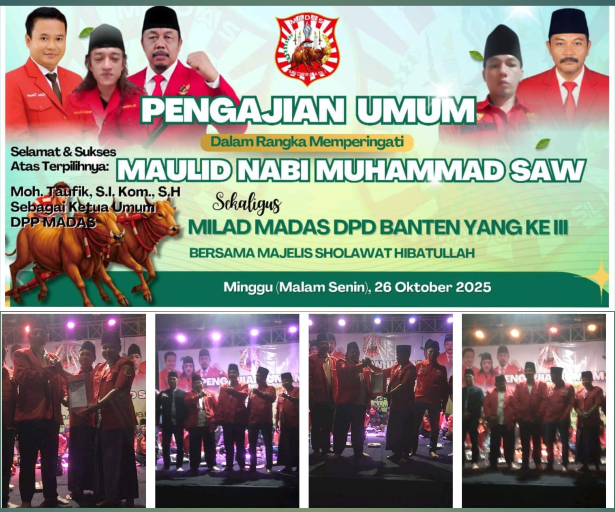 mitrapolisi.com, Banten, 27 Oktober 2025 — DPD MADAS Banten menggelar Pengajian Umum dan Peringatan Maulid Nabi Muhammad SAW yang berlangsung khidmat dan meriah di wilayah Banten. Kegiatan ini menjadi momen penting bagi keluarga besar Ormas Madura Asli (MADAS), karena sekaligus dilakukan pelantikan tiga Dewan Pimpinan Daerah (DPD), yakni DPD DKI Jakarta, DPD Jawa Barat, dan DPD Banten.