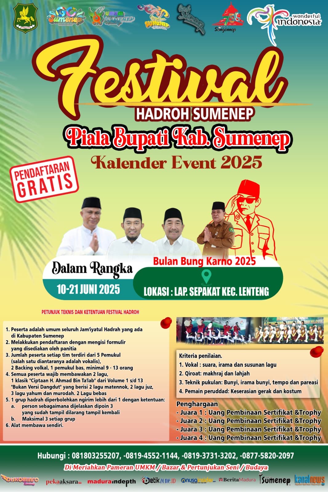 Sumenep||mitrapolisi – Dalam rangka memperingati Bulan Bung Karno 2025, Pemerintah Kabupaten Sumenep menggelar Festival Hadroh Sumenep yang memperebutkan Piala Bupati Sumenep. Kegiatan ini masuk dalam kalender resmi event daerah dan akan berlangsung 10–21 Juni 2025 di Lapangan Sepakat, Kecamatan Lenteng.