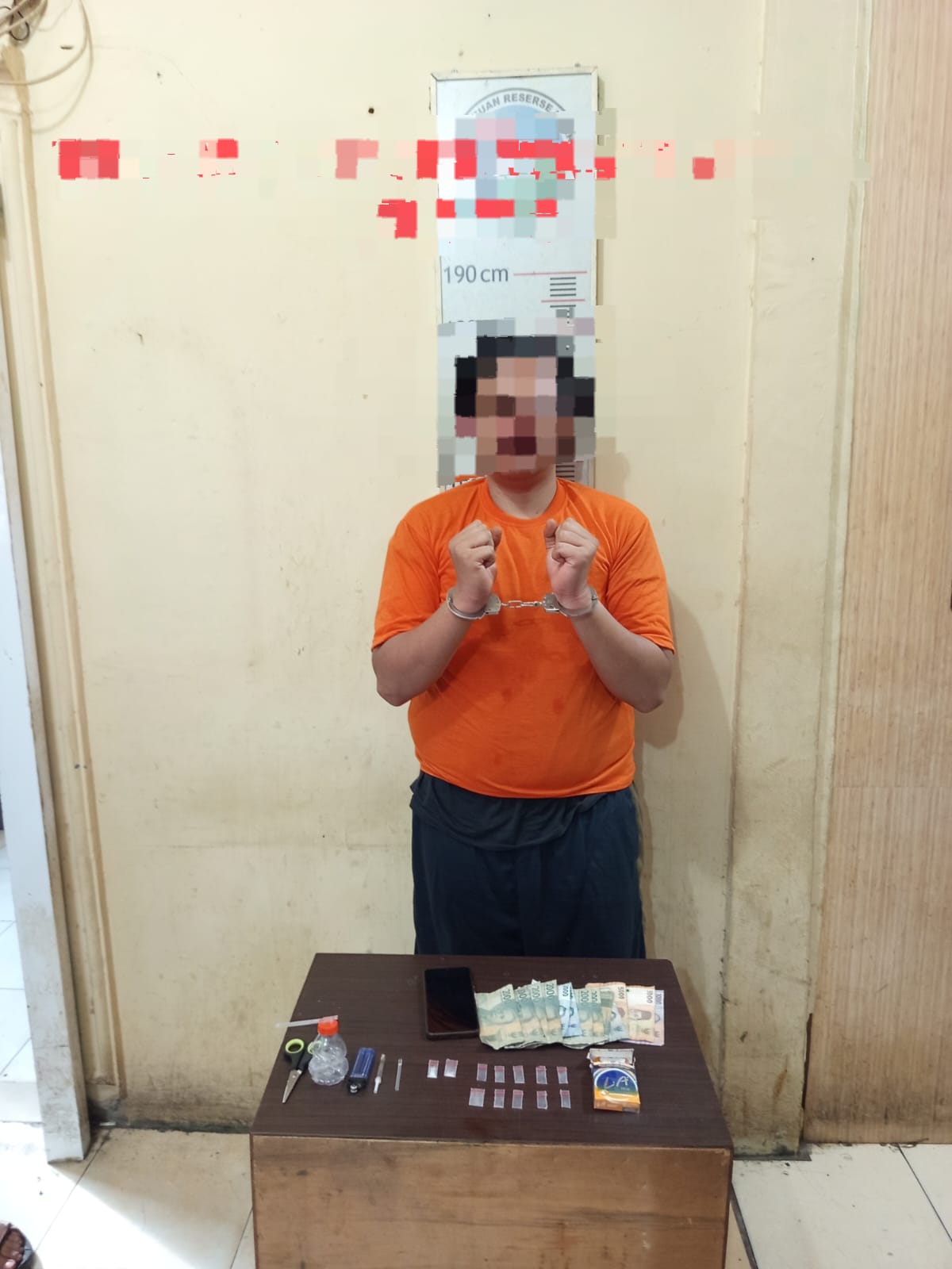 Dalam penangkapan tersebut, petugas berhasil mengamankan barang bukti berupa 2 (dua) bungkus plastik klip bening yang didalamnya diduga berisikan narkotika jenis Sabu dengan brutto 0,24 (nol koma dua empat)Gram,1 (satu) buah kaca pirex, 1 (satu) bungkus kotak rokok merek L.A, 1 (satu) buah jarum suntik, 1 (satu) buah sekop sabu, 10 (sepuluh) bungkus plastik klip bening kosong, 1 (satu) buah Hp android merek vivo, 1 (satu) buah mancis, 1 (satu) buah alat penghisap sabu ,1 (satu) buah gunting dan Uang tunai sebesar Rp. 40.000 . (Empat puluh ribu rupiah).