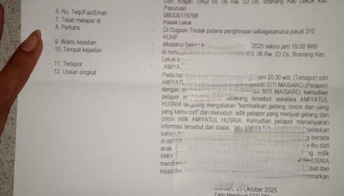 Pasuruan Mitrapolisi.com kamis (23/10) Merasa tidak melakukan pencurian dan merasa nama baik nya di serang seorang ibu rumah tangga siti maisaro asal branang Lekok resmi buat aduan ke Polsek lekok kamis 23 Oktober 2025,melalui lembaga bantuan hukum OBHAMA NUSANTARA