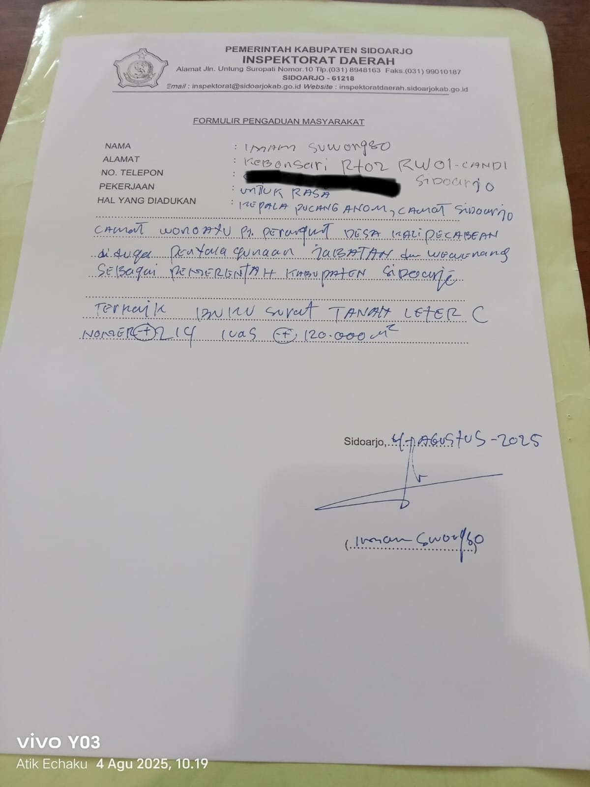 Warga Kebonsari Candi Laporkan Oknum ASN, Camat dan Perangkat Desa ke Inspektorat Sidoarjo